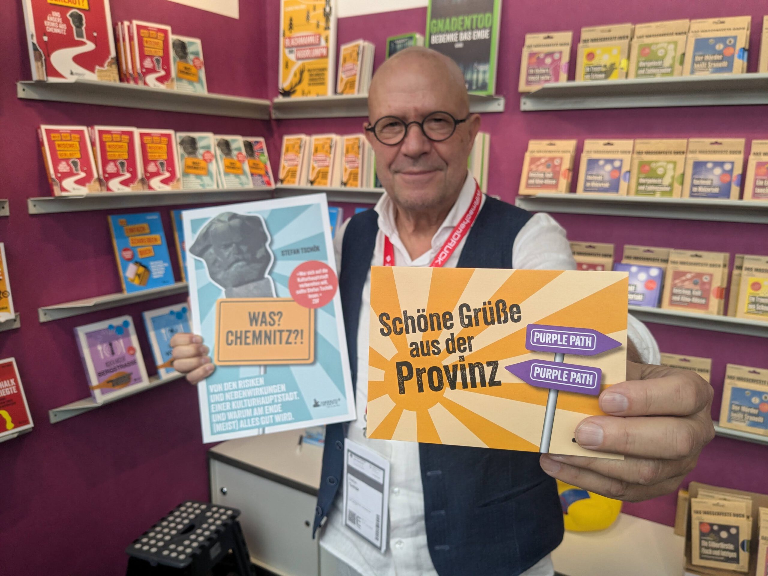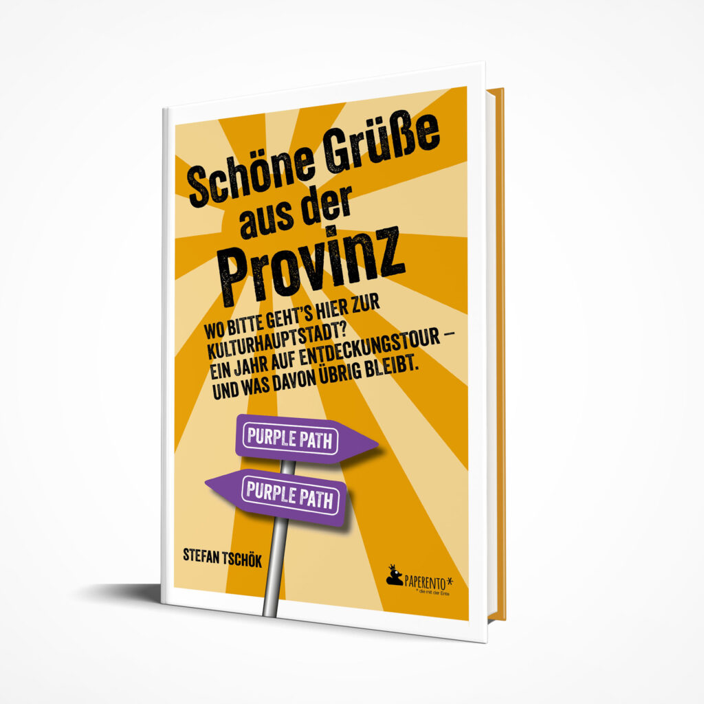 Entlang des Skultpurenwegs „Purple Path“ führte seine Reise Tschök durch Städte und Gemeinden der Kulturregion. Er talkte im Cabrio ebenso wie in der Kulturkirche, saß vor einer Hartmannlok und in einer historischen Tanzbar, diskutierte mit seinen Gesprächspartnern mal im Theater, mal im Trausaal, mal im Möbelhaus. Und einmal wurde sogar ein Kunstwerk zur Bühne. Tschök ist diplomierter Verkehrswirtschaftler, war lange Zeit Sprecher der Chemnitzer Verkehrsbetriebe CVAG. Den Bewerbungsprozess von Chemnitz als Kulturhauptstadt Europas hatte er von Anfang an begleitet. Für „Schöne Grüße aus der Provinz“ hat er Stimmen zum Großevent in der Region gesammelt – und den Menschen auf den Zahn gefühlt. Herausgekommen ist eine ebenso augenzwinkernde wie ganz subjektive Betrachtung eines Jahres im Ausnahmezustand.