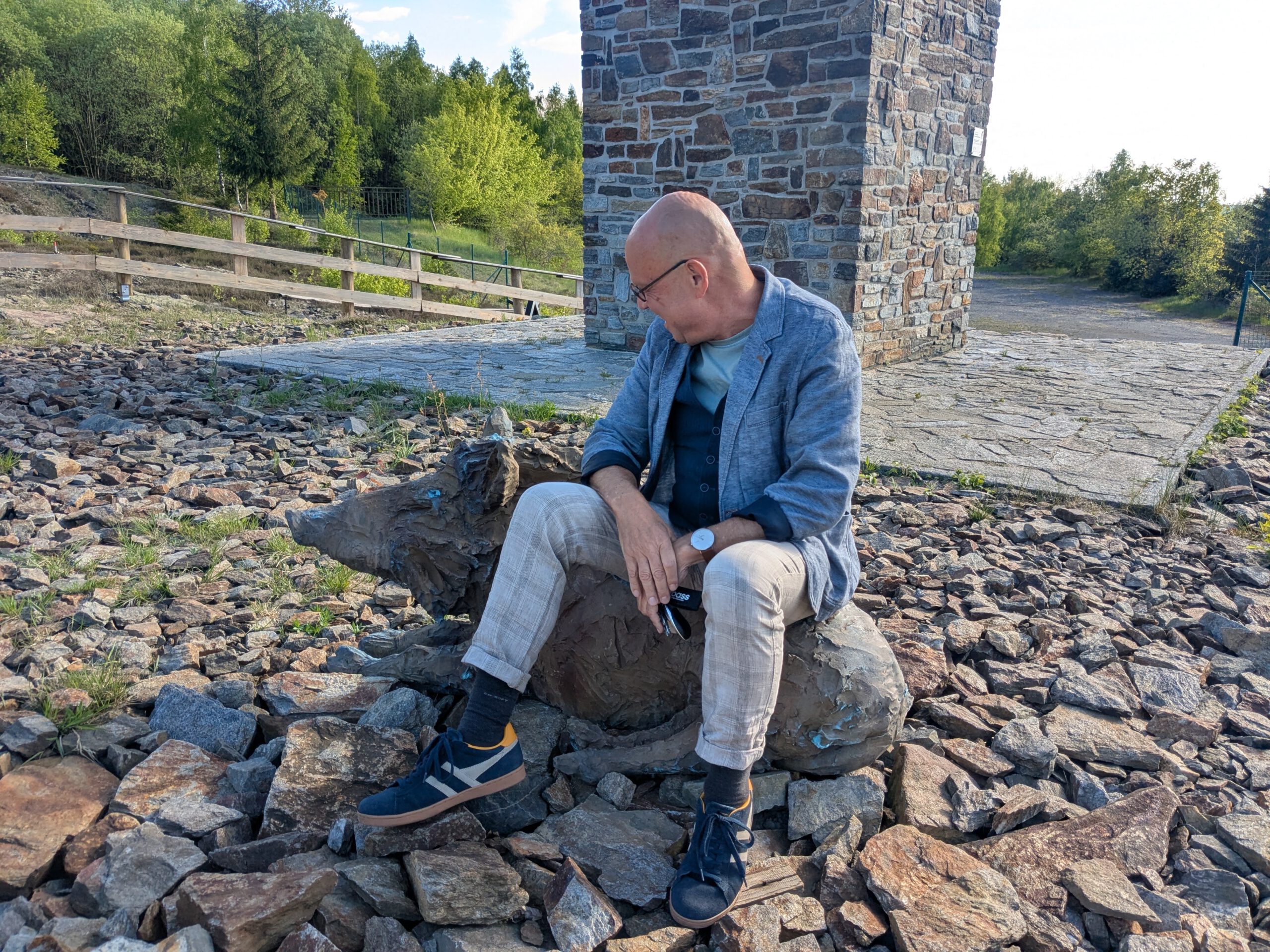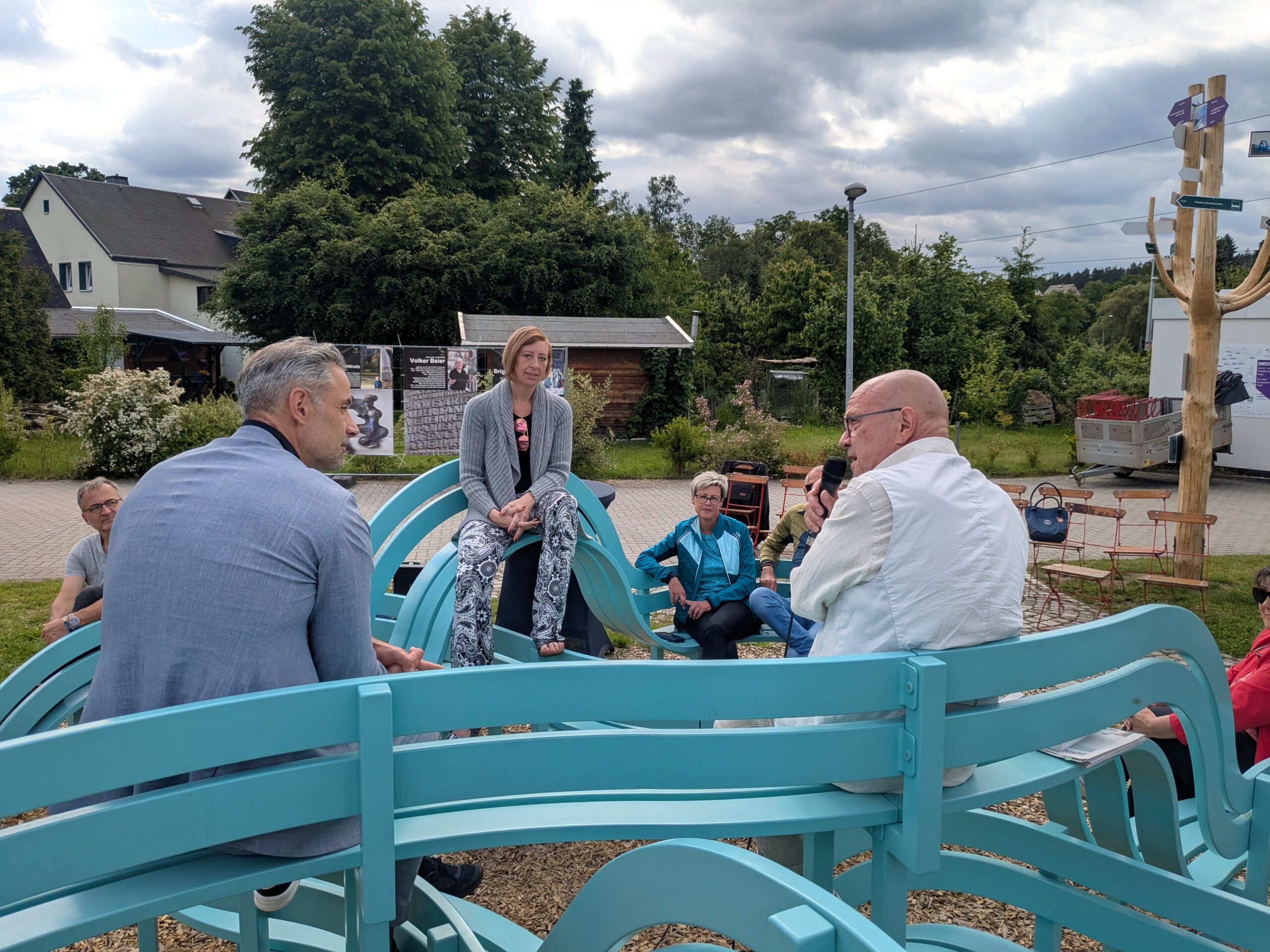 Gäste: Sascha Thamm (Bürgermeister Neukirchen/Erz.) und Stefanie Abelmann (Eventmanagerin/Makers, Business & Arts, Landesverband der Kultur-und Kreativwirtschaft Sachsen e.V.) - 27.05.2025: Jahnsdorf/Erzgeb., am Kunstwerk „Modified Social Bench #1 for Jahnsdorf“ von Jeppe Hein, Nähe Bahnhof