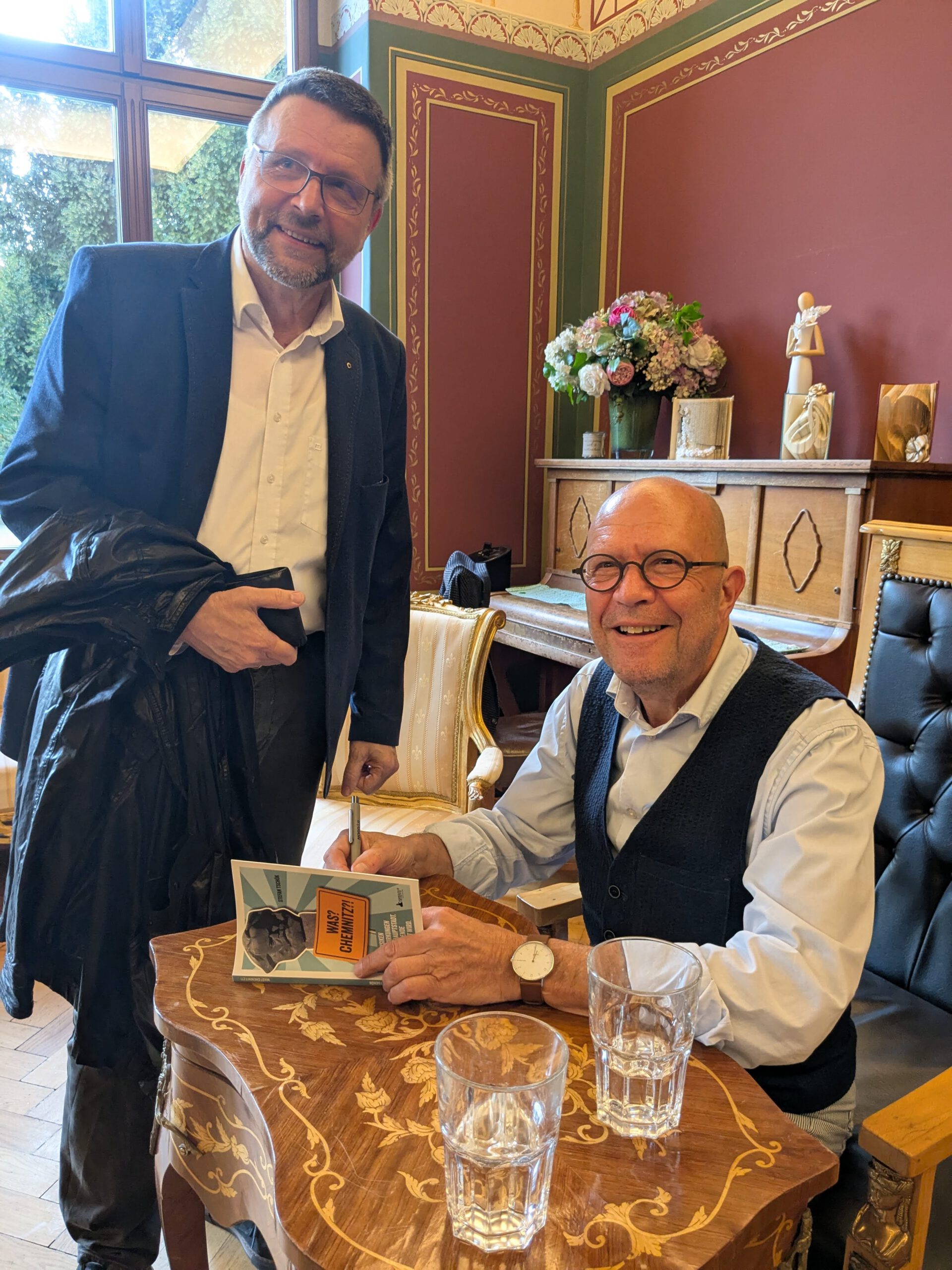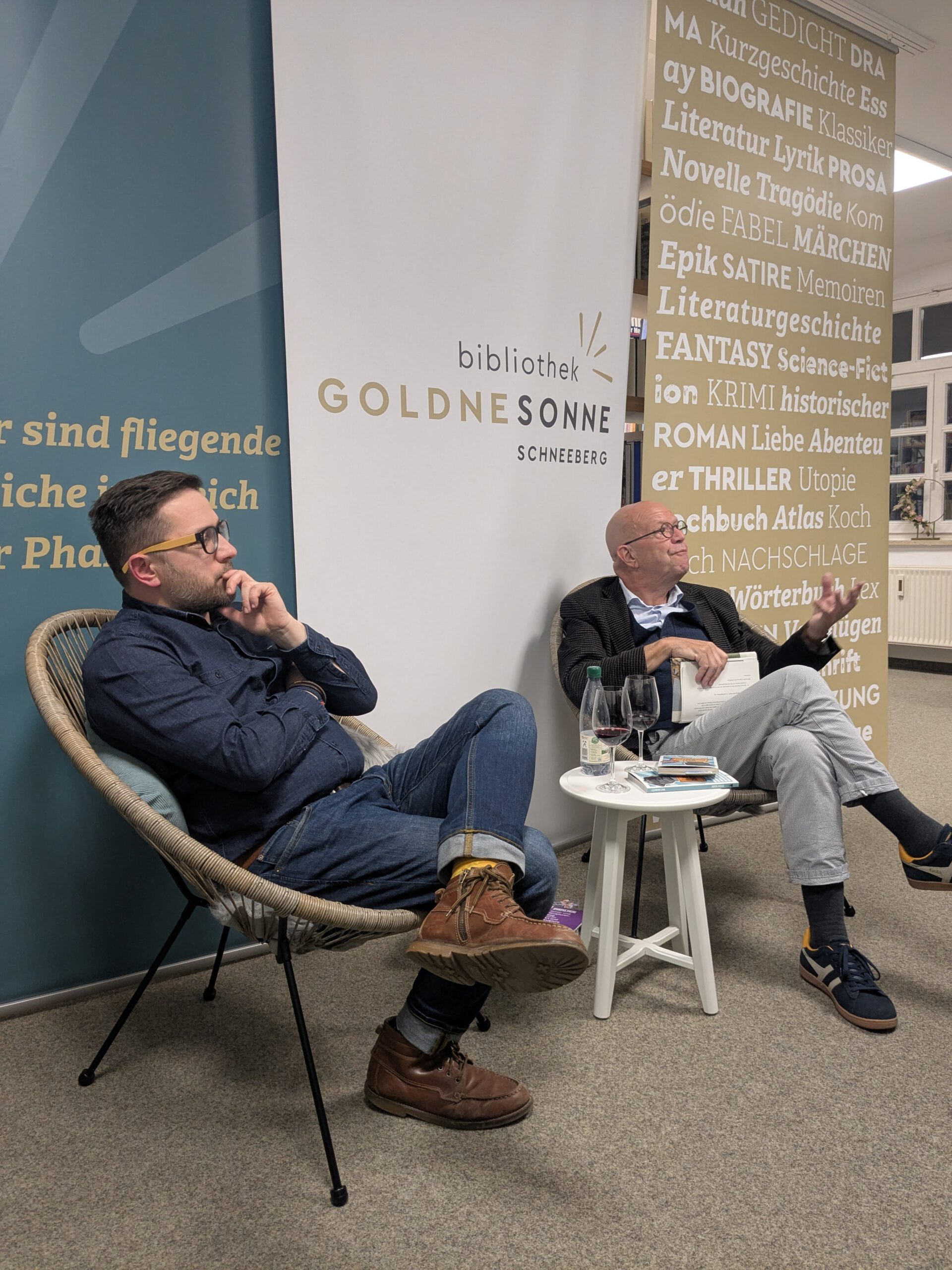 Gäste: Volker Holuscha, Oberbürgermeister Flöha, und Dr. Sylva-Michèle Sternkopf, Autorin und Marketing-Expertin - 04.04.2025: Schneeberg, Bibliothek in der „Goldnen Sonne“